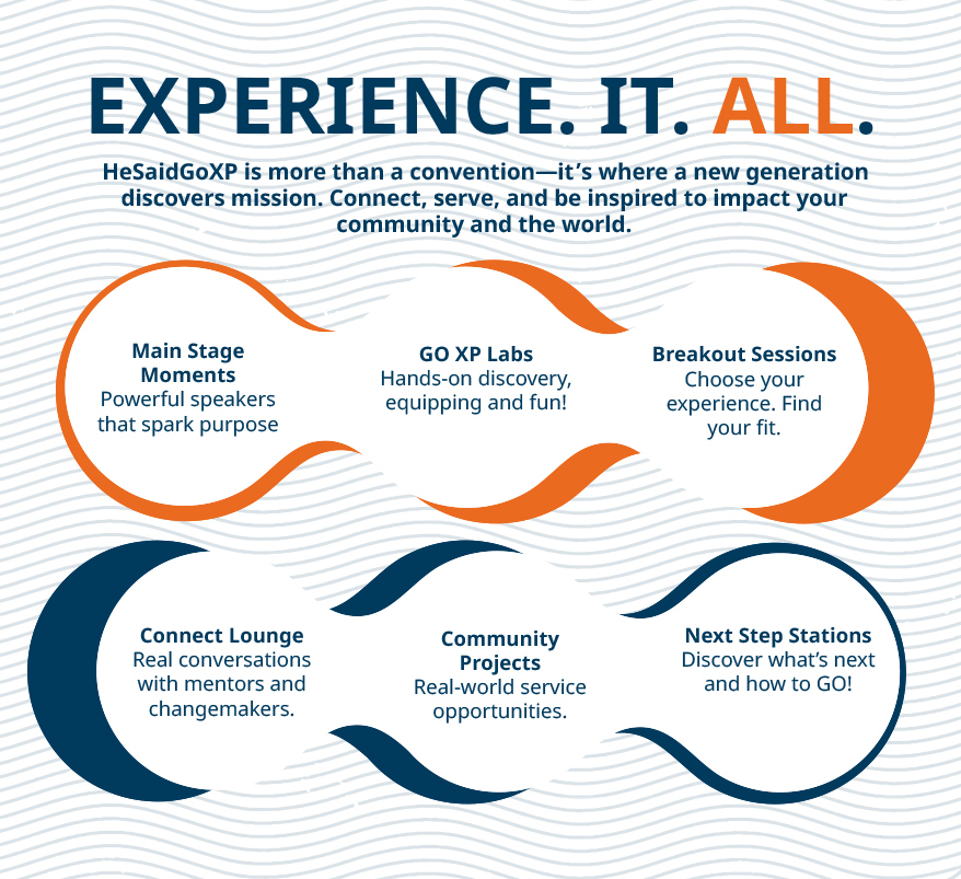 HeSaidGoXP is a high-energy, three-day experience designed to ignite passion, purpose, and a heart for service in college students and young adults across North America. Through hands-on XP Labs, dynamic speakers, and interactive sessions, participants discover how their unique gifts connect to local and global mission opportunities. More than volunteer recruitment, HeSaidGoXP cultivates a missional identity—shaping bold, faith-driven leaders ready to impact the world with compassion and conviction.
