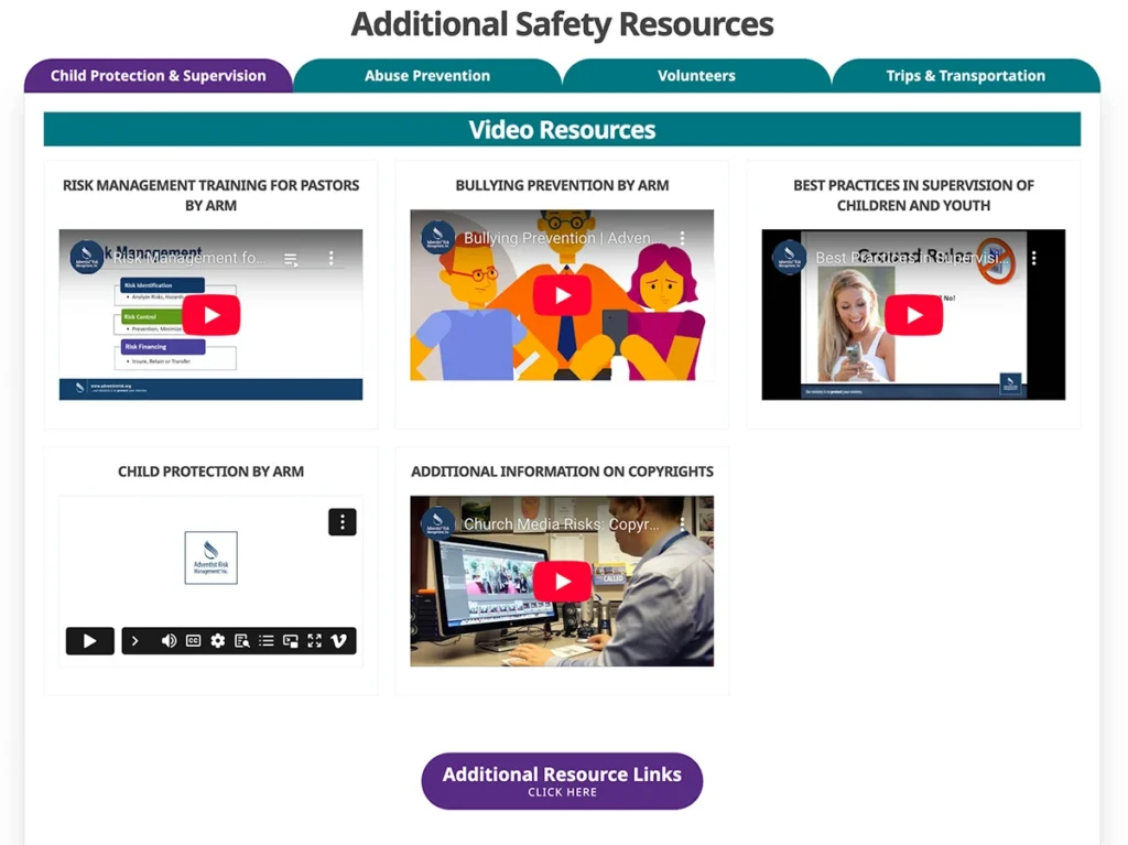 Further down the page you will find “Additional Safety Resources” video and link resources under each tab.